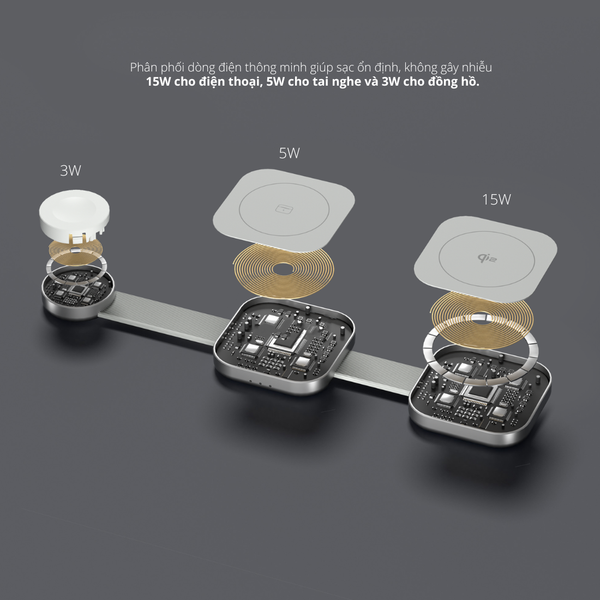 MagTrifold03 hỗ trợ chuẩn sạc không dây Qi2 công suất 15W, tương thích MagSafe, giúp iPhone tự động căn chỉnh đúng vị trí để sạc nhanh và hiệu quả hơn. Bên cạnh đó, hệ thống sạc độc lập 3 lõi phân bổ năng lượng thông minh cho từng thiết bị: 15W cho iPhone, 5W cho AirPods và 3W cho Apple Watch đảm bảo quá trình sạc ổn định và an toàn.