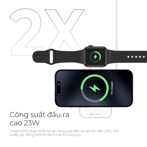 Chỉ với một thiết bị duy nhất, MagFold05 cho phép sạc đồng thời iPhone, Apple Watch và AirPods, loại bỏ hoàn toàn cảnh dây cáp chằng chịt trên bàn làm việc hay trong balo. Tổng công suất đầu ra lên đến 23W, hỗ trợ sạc không dây Qi2 công suất 15W, tương thích hoàn hảo với MagSafe và các thiết bị Qi2. Lực hút từ tính chắc chắn giúp iPhone cố định đúng vị trí, sạc nhanh hơn, an toàn hơn và hạn chế thất thoát năng lượng trong quá trình sử dụng.