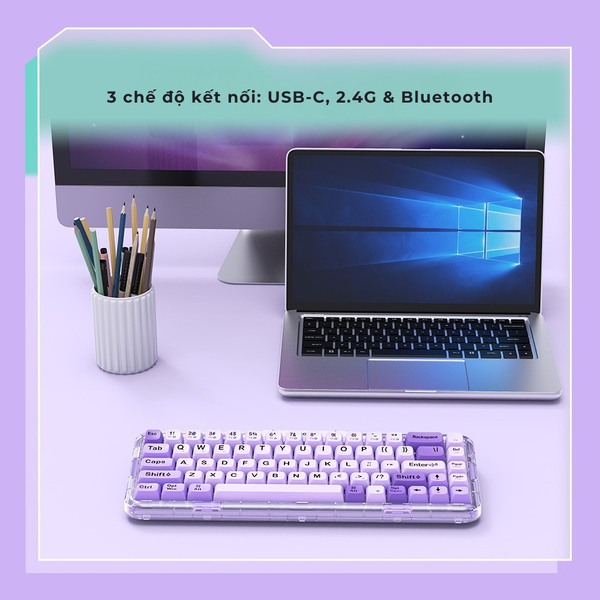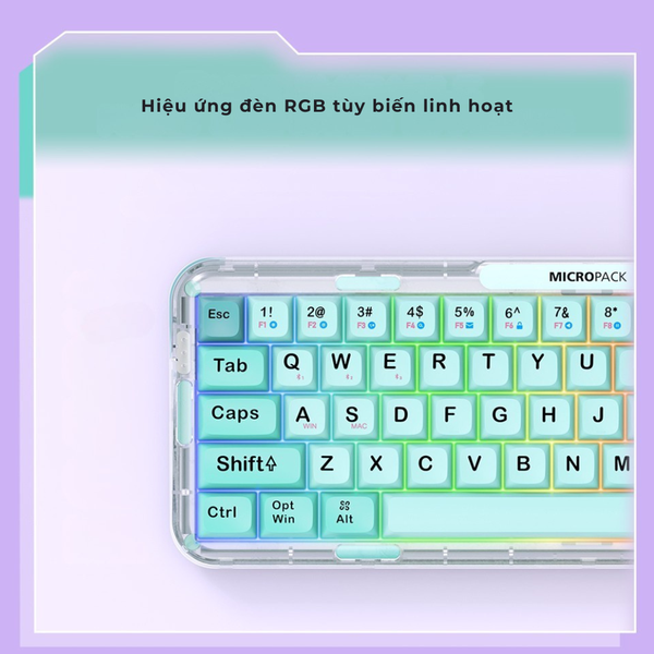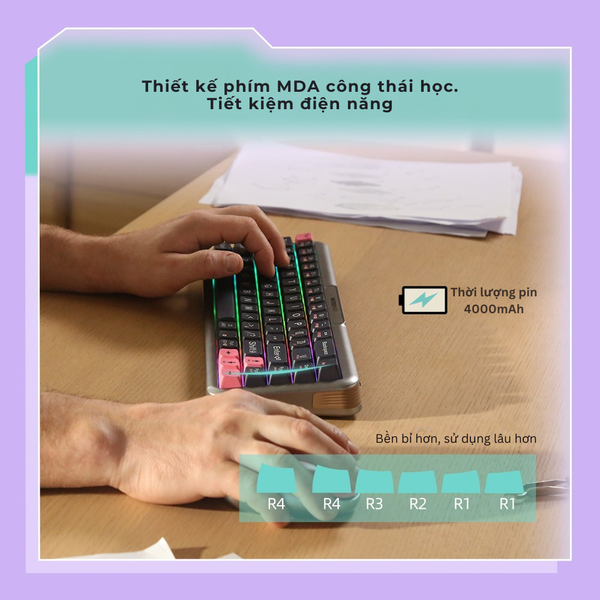 Nổi bật nhất là hệ thống đèn nền RGB 16 triệu màu, mỗi phím sẽ có ánh sáng riêng và có thể tùy chỉnh. Với 19 hiệu ứng ánh sáng khác nhau, người dùng dễ dàng cá nhân hóa bàn phím theo phong cách hay không gian làm việc, vừa hỗ trợ làm việc buổi tối vừa tạo cảm hứng sử dụng mỗi ngày.