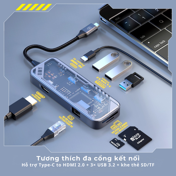 Về hiệu năng, MDC-N8T hỗ trợ độ phân giản đến 4K@60Hz, hình ảnh sắc nét và mượt mà cùng cổng USB 3.2 cho tốc độ truyền dữ liệu nhanh giúp sao chép tập tin lớn chỉ trong thời gian ngắn