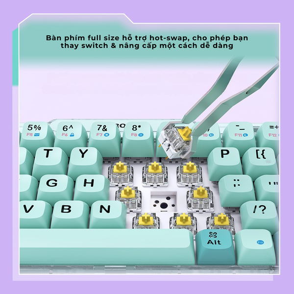 Thiết kế phím MDA công thái học cùng kích thước 68 phím gọn gàng giúp giảm căng thẳng cho tay và cổ tay khi sử dụng trong thời gian dài. Ngoài ra, bàn phím còn hỗ trợ hot-swap, cho phép thay thế và nâng cấp switch dễ dàng mà không cần hàn, mang lại sự linh hoạt cho người dùng yêu thích cá nhân hóa.