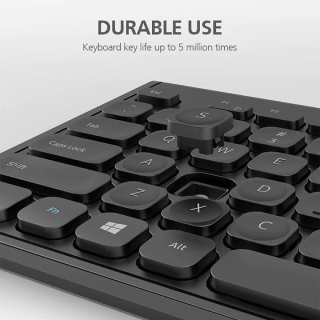 Bàn phím chuột Bluetooth sử dụng cơ chế phím màng (membrane) kết hợp với thiết kế low-cap, mang đến trải nghiệm gõ phím tối ưu. Thiết kế này không chỉ giúp tối đa hóa lực nhấn mà còn hạn chế tiếng ồn, tạo điều kiện lý tưởng cho những buổi làm việc yên tĩnh.