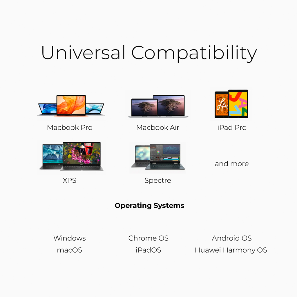 Hỗ trợ macOS, Windows, iPadOS, Android OS, Chrome OS, HarmonyOS. Hoàn hảo cho MacBook, iPad Pro, Chromebook, laptop, tablet và smartphone USB-C.