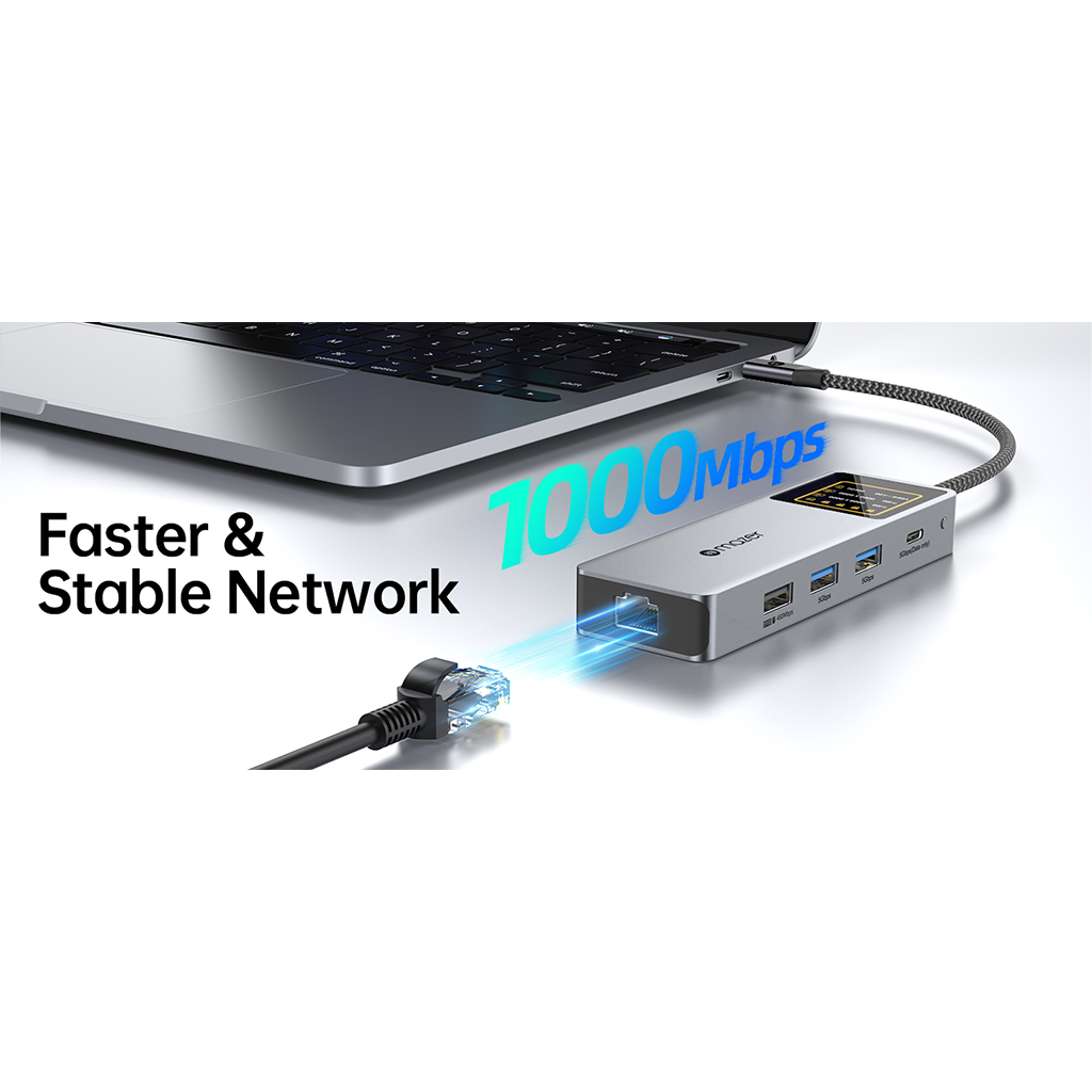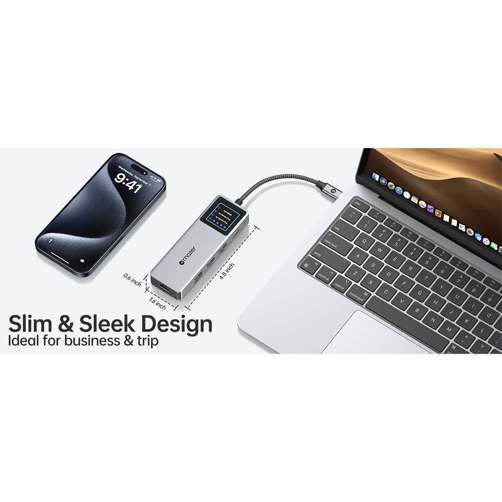 Màn hình tích hợp hiển thị real-time trạng thái sạc và độ phân giải xuất hình, giúp bạn kiểm soát toàn bộ kết nối một cách trực quan.