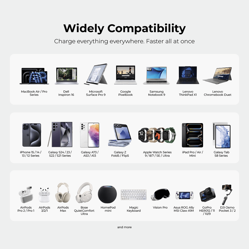 Dù là laptop, smartphone hay phụ kiện nhỏ như tai nghe, bạn chỉ cần một bộ sạc duy nhất cho mọi nhu cầu.