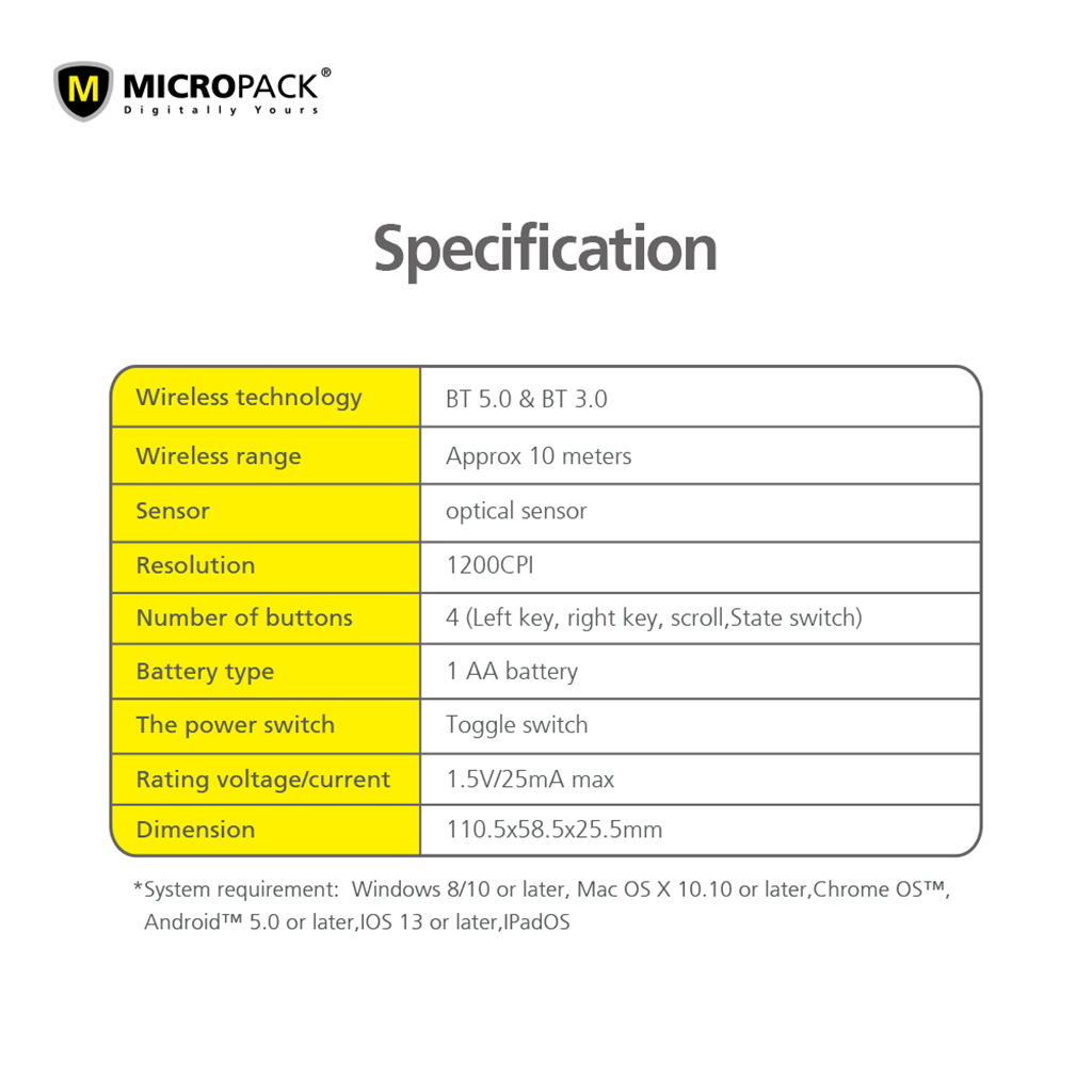Chuột không dây MicroPack Inspire 2 MP-707B được trang bị công nghệ Bluetooth 5.0/3.0, mang đến khả năng kết nối nhanh chóng, ổn định với nhiều thiết bị khác nhau. Với phạm vi kết nối lên đến 10 mét, bạn có thể thoải mái làm việc mà không lo gián đoạn hay mất kết nối.