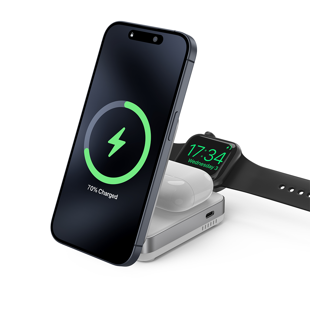 Trạm sạc không dây 3 trong 1: Cấp nguồn cho iPhone, Apple Watch và AirPods cùng lúc, với giá đỡ điện thoại có thể điều chỉnh.