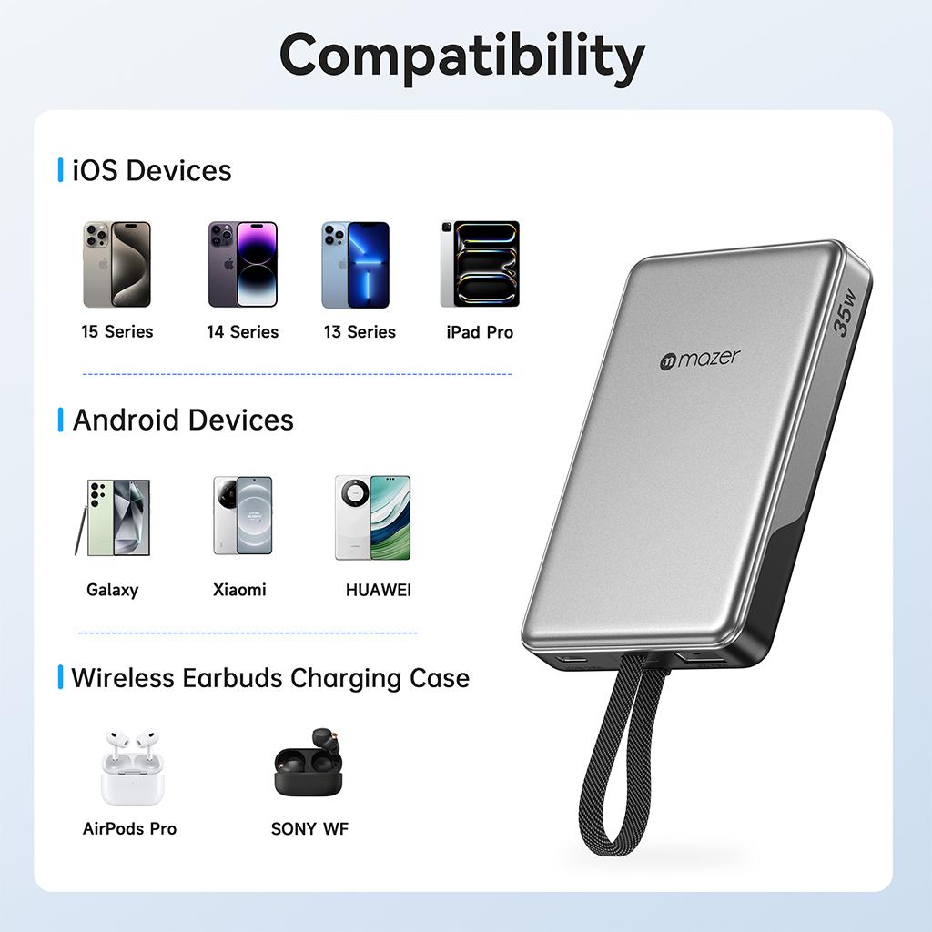 Mazer PowerCharge Link 10,000mAh PD/PPS 35W là pin dự phòng cao cấp dành cho người dùng cần sạc nhanh, ổn định và linh hoạt trong cuộc sống hiện đại. Sở hữu dung lượng pin lớn 10,000mAh, hỗ trợ sạc nhanh PD/PPS công suất lên đến 35W, cùng cáp USB-C tích hợp sẵn và màn hình hiển thị kỹ thuật số, sản phẩm đáp ứng hoàn hảo nhu cầu sạc cho điện thoại, máy tính bảng và các thiết bị USB-C.