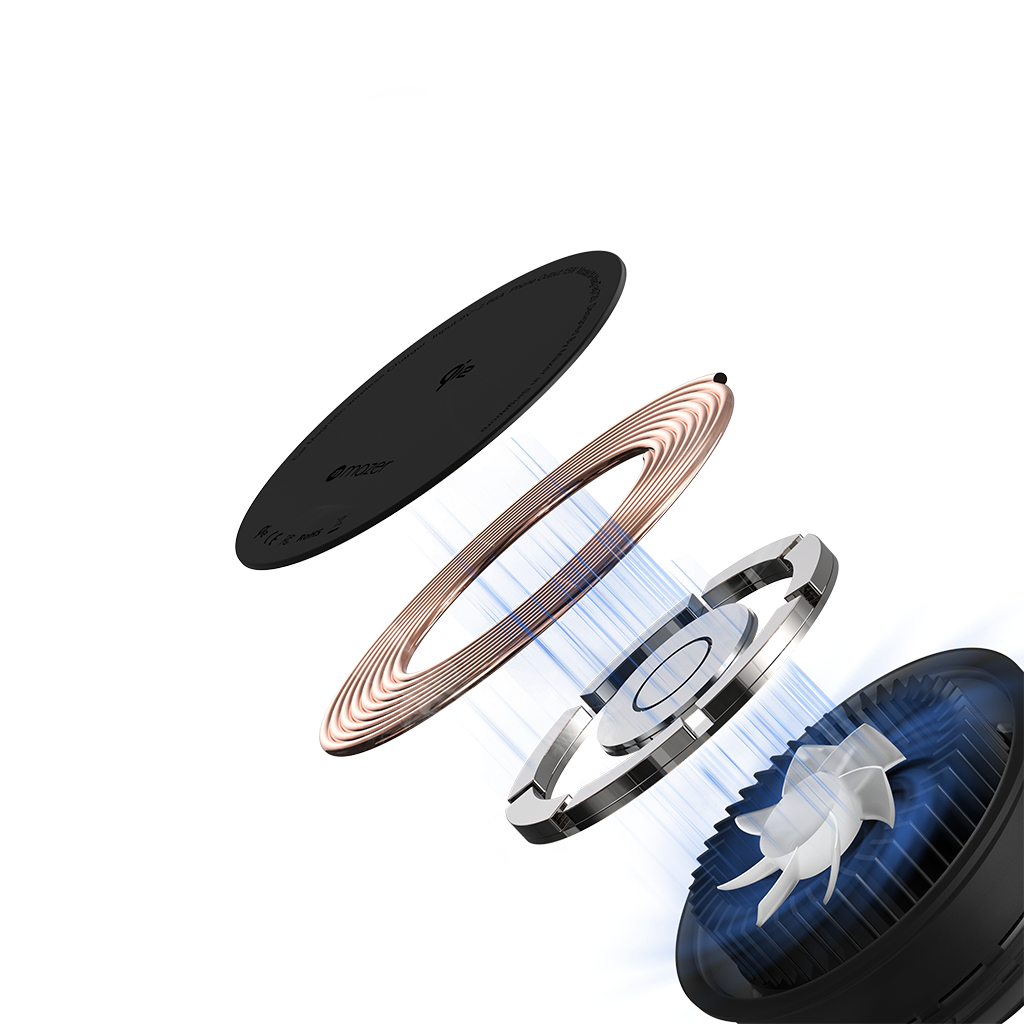 - Hệ thống tản nhiệt chủ động: Quạt làm mát giảm nhiệt cho cả cuộn sạc và điện thoại, duy trì tốc độ sạc 15W ổn định.