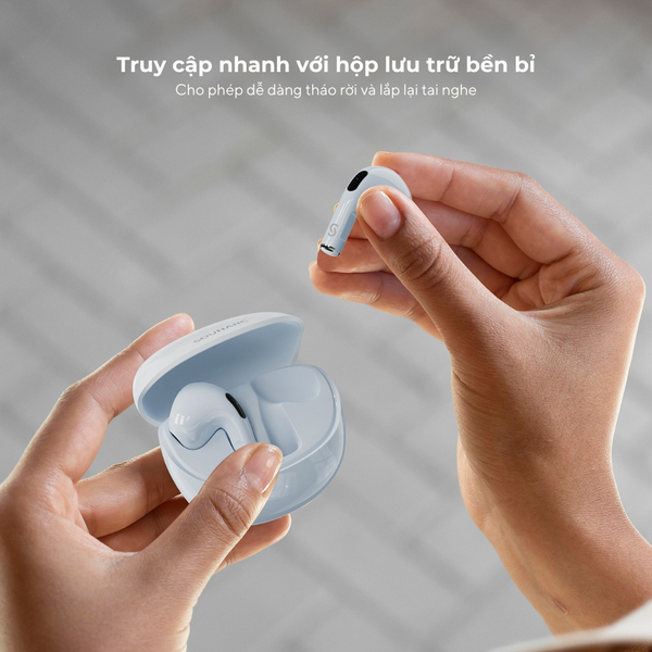 Bên cạnh đó, phần thân tai nghe được thiết kế theo chuẩn công thái học, giúp tai nghe bám vừa vặn vào vành tai mà không cần nhét sâu. Nhờ đó, người dùng có thể thoải mái vận động, di chuyển liên tục – từ đi bộ, đạp xe cho đến chạy bộ nhẹ – mà vẫn yên tâm tai nghe không dễ rơi ra.